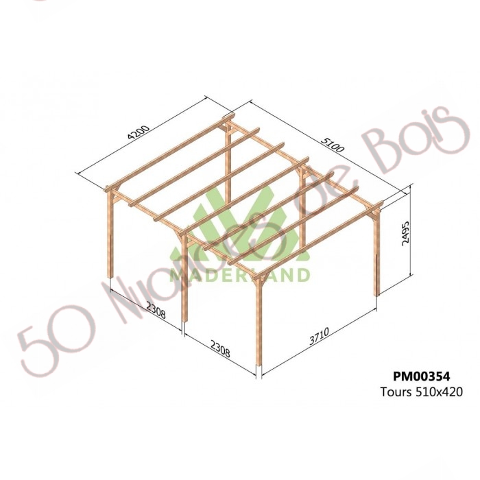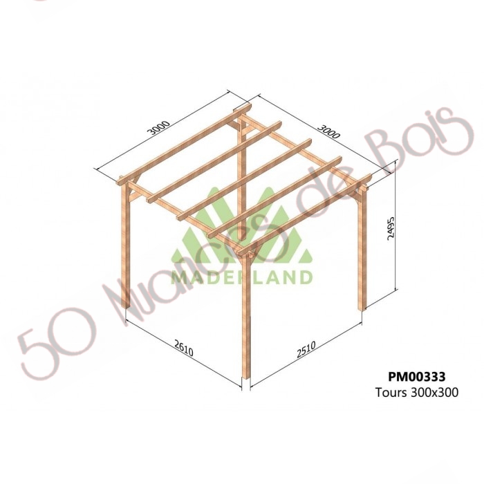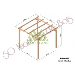 RÉSUMÉ DE CARACTÉRISTIQUES: DIMENSIONS: 300×300 cm (longueur x profondeur) STRUCTURE: autoportante RÉSISTANCE: moyenne-élevée MATÉRIAU: bois de pin massif TRAITEMENT: autoclave de niveau IV vert MONTAGE FACILE: en environ 60 minutes LIVRAISON: incluse La pergola bois TOURS est fabriquée par Maderlan