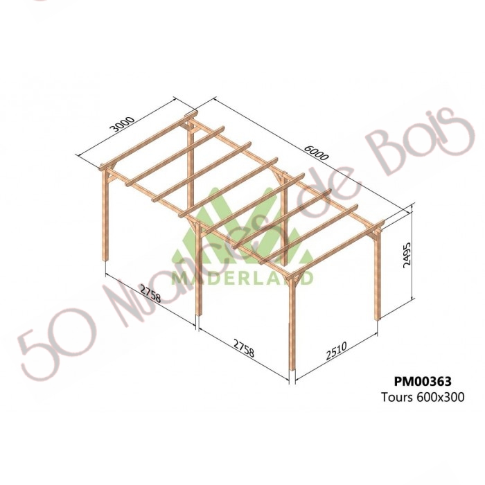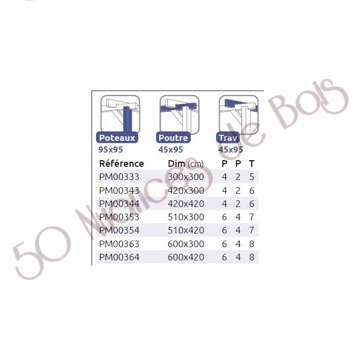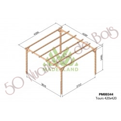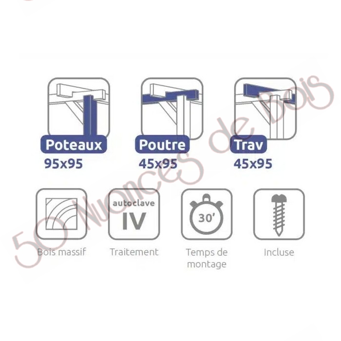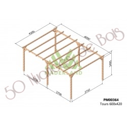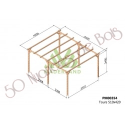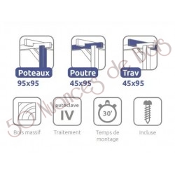 La quantité de poteaux, de poutres et de traverses peut varier en fonction des dimensions choisies, cette pergola a 4 poteaux, 2 poutres et 5 traverses.