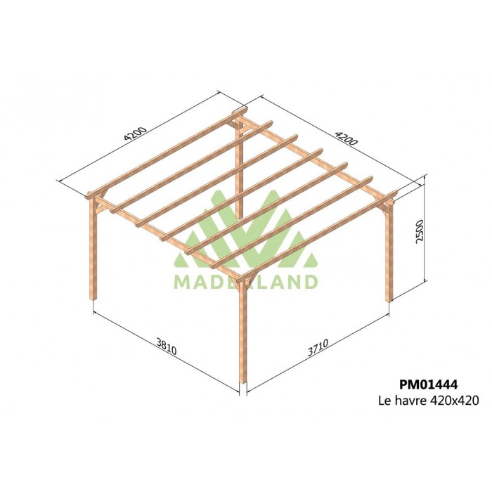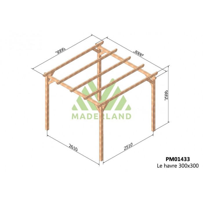 RÉSUMÉ DE CARACTÉRISTIQUES: DIMENSIONS: 300×300 cm (longueur x profondeur) STRUCTURE: autoportante RÉSISTANCE: élevée MATÉRIAU: bois de pin massif TRAITEMENT: autoclave de niveau IV vert MONTAGE FACILE: en environ 60 minutes LIVRAISON: incluse La pergola bois LE HAVRE est fabriquée par Maderland en