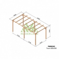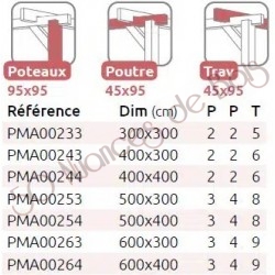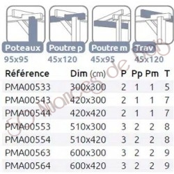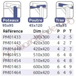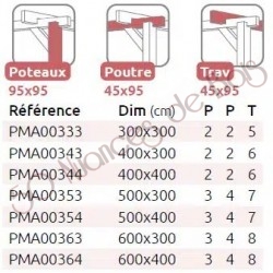 La quantité de poteaux, de poutres et de traverses peut varier en fonction des dimensions choisies, cette pergola a 4 poteaux, 2 poutres et 5 traverses.