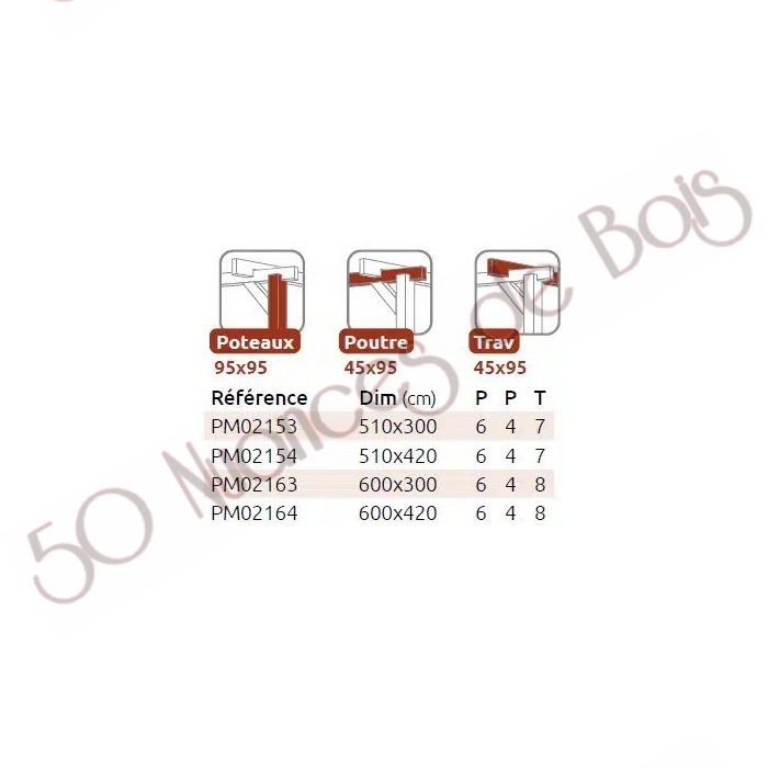 La quantité de poteaux, de poutres et de traverses peut varier en fonction des dimensions choisies, ce carport a 6 poteaux, 4 poutres et 7 ou 8 traverses.