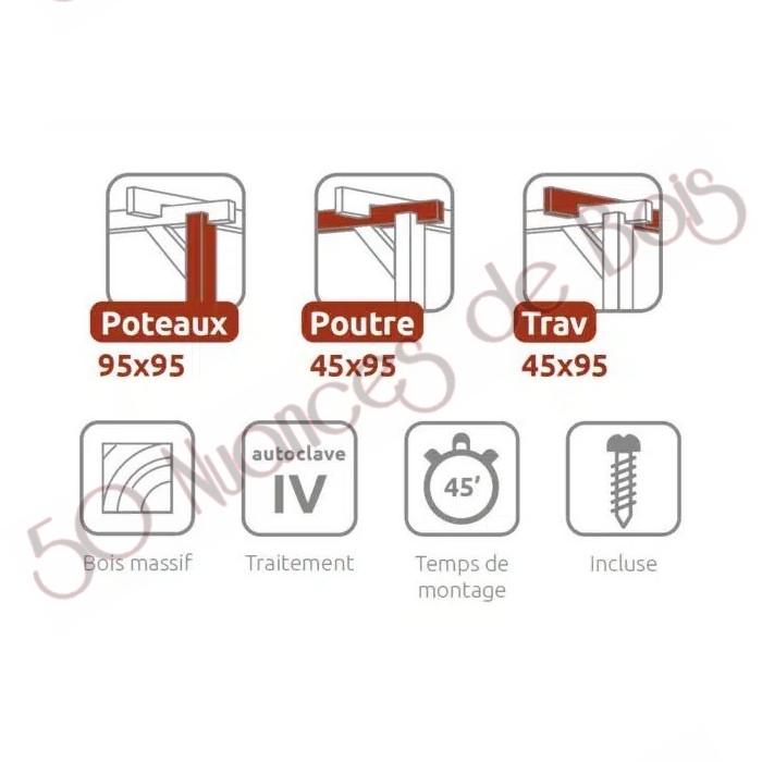 Vous pouvez couvrir le toit de ce carport bois avec une solution telle qu’une bâche, un auvent coulissant, du canisse ou d’autres solutions similaires pour obtenir un espace ombragé et protégé du vent et de la pluie. Pour une stabilité correcte de cette tonnelle de jardin, il est impératif de le fixer correctement au sol. Pour ce faire, nous vous recommandons d’utiliser nos supports métalliques et d’acheter les vis appropriées en fonction de la surface sur laquelle il sera installé.