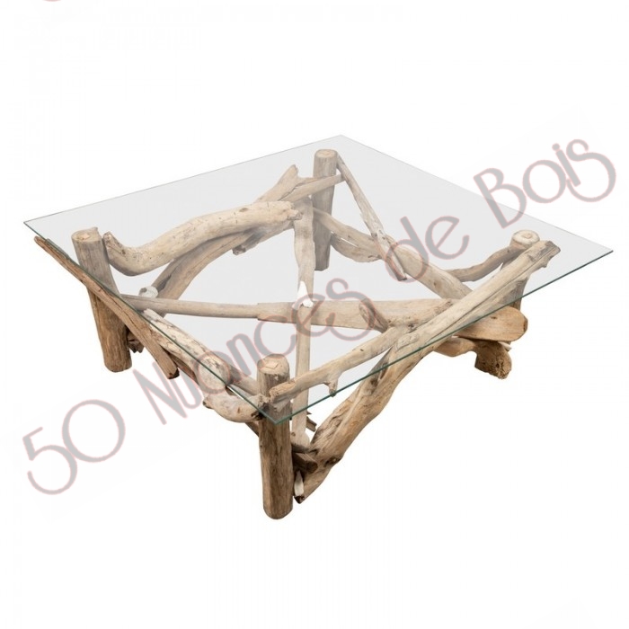 Le plateau en verre transparent ajoute une touche de modernité et met en valeur la beauté naturelle du bois flotté.