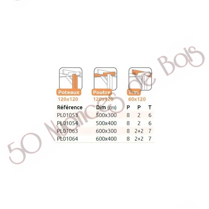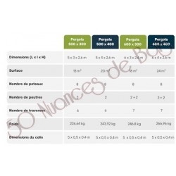 La quantité de poteaux, de poutres et de traverses peut varier en fonction des dimensions choisies, cette pergola a 8 poteaux, 2 poutres et 6 ou 7 traverses.