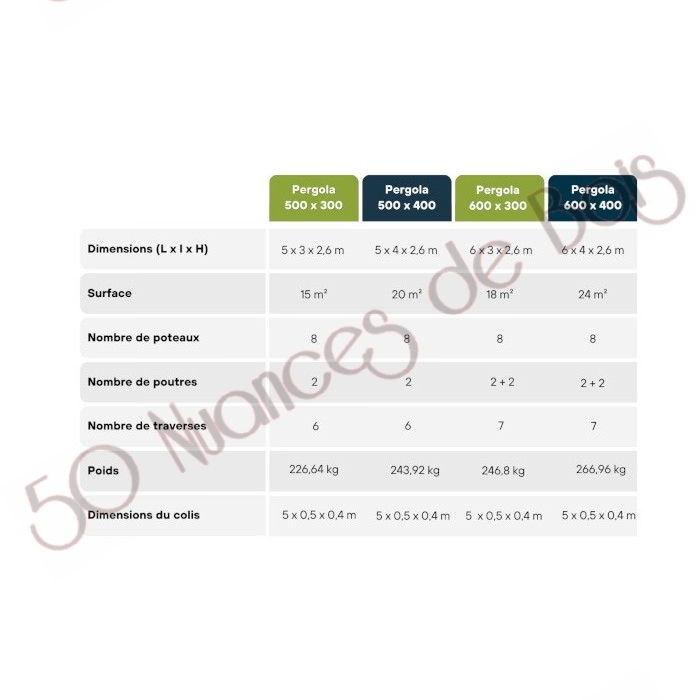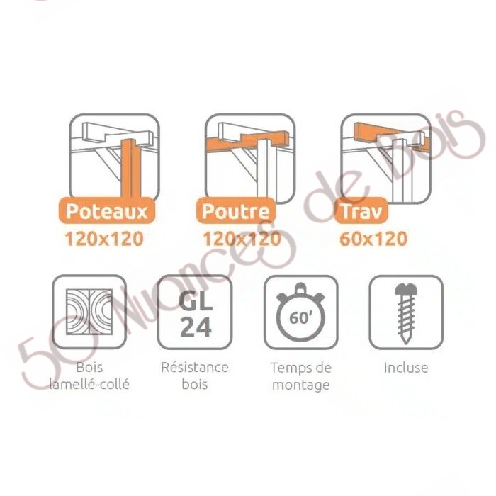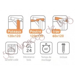 Le bois lamellé-collé utilisé dans cette pergola bois se distingue comme un matériau plus résistant et ayant de meilleures performances que le bois massif, en raison de son processus de fabrication conforme à des normes strictes établies par l’UE.