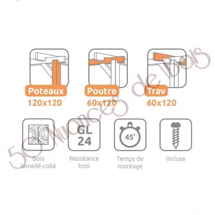 Le bois lamellé-collé utilisé dans cette pergola bois se distingue comme un matériau plus résistant et ayant de meilleures performances que le bois massif, en raison de son processus de fabrication conforme à des normes strictes établies par l’UE.