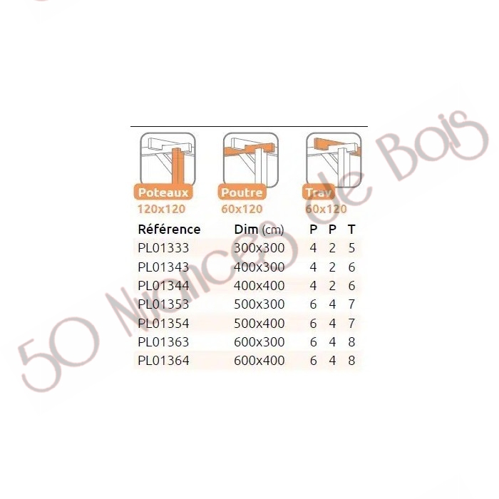 La quantité de poteaux, de poutres et de traverses peut varier en fonction des dimensions choisies.