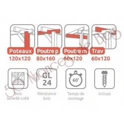 La quantité de poteaux, de poutres et de traverses peut varier en fonction des dimensions choisies, cette pergola a 2 ou 3 poteaux, 1 poutre porteuse, 1 poutre de mur et (3à6+2) 5 à 8 traverses.
