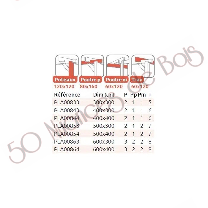 La quantité de poteaux, de poutres et de traverses peut varier en fonction des dimensions choisies, cette pergola a 2 ou 3 poteaux, 1 poutre porteuse, 1 poutre de mur et (3à6+2) 5 à 8 traverses.