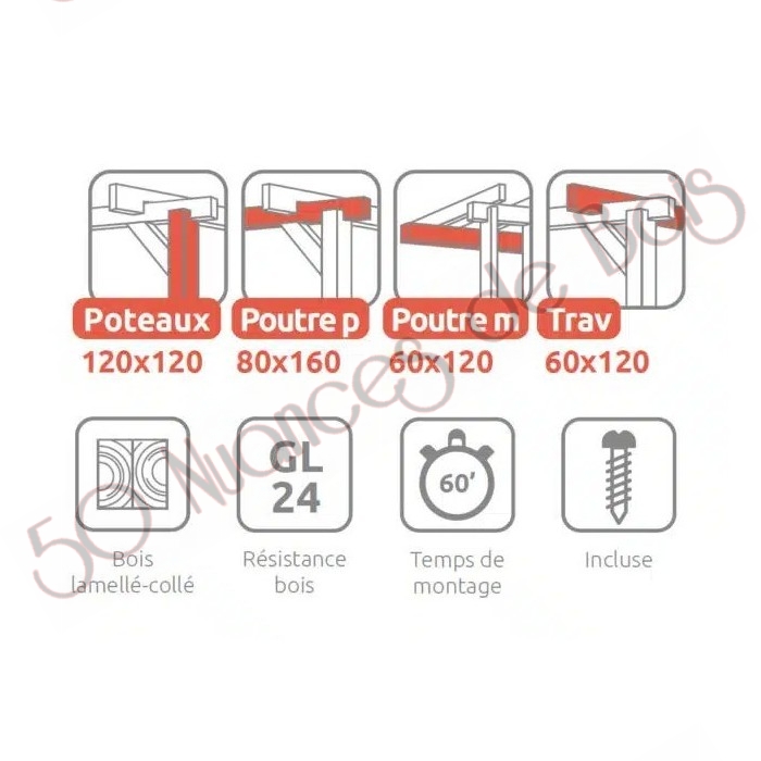 Le bois lamellé-collé utilisé dans cette pergola bois se distingue comme un matériau plus résistant et ayant de meilleures performances que le bois massif, en raison de son processus de fabrication conforme à des normes strictes établies par l’UE.