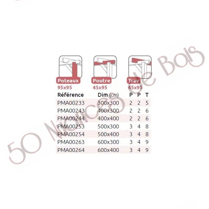 La quantité de poteaux, de poutres et de traverses peut varier en fonction des dimensions choisies, cette pergola a 2 ou 3 poteaux, 1 ou 2 poutres porteuses, 1 ou 2 poutres de mur et 5 à 9 traverses.
