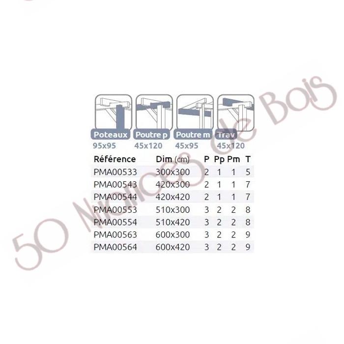 La quantité de poteaux, de poutres et de traverses peut varier en fonction des dimensions choisies, cette pergola a 2 ou 3 poteaux, 1 ou 2 poutres porteuses, 1 ou 2 poutres de mur et 5 à 9 traverses.