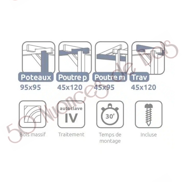 Vous pouvez couvrir le toit de cette pergola bois avec une solution telle qu’une bâche, un auvent coulissant, du canisse ou d’autres solutions similaires pour obtenir un espace ombragé et protégé du vent et de la pluie. Pour une stabilité correcte de cette tonnelle de jardin, il est impératif de la fixer correctement au sol. Pour ce faire, nous vous recommandons d’utiliser nos supports métalliques et d’acheter les vis appropriées en fonction de la surface sur laquelle elle sera installée.