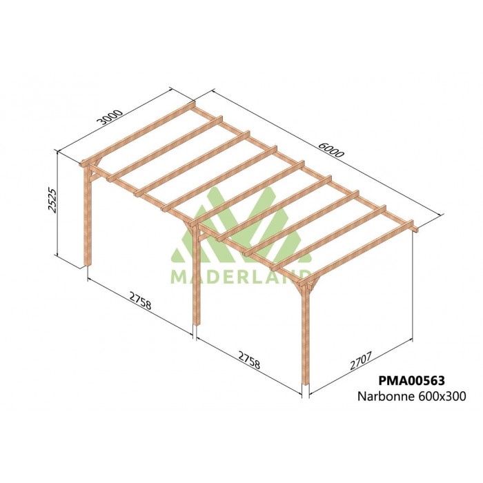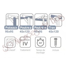 La quantité de poteaux, de poutres et de traverses peut varier en fonction des dimensions choisies, cette pergola a 2 ou 3 poteaux, 1 ou 2 poutres porteuses, 1 ou 2 poutres de mur et 5 à 9 traverses.