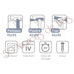 La quantité de poteaux, de poutres et de traverses peut varier en fonction des dimensions choisies, cette pergola a 2 ou 3 poteaux, 1 ou 2 poutres porteuses, 1 ou 2 poutres de mur et 5 à 8 traverses.