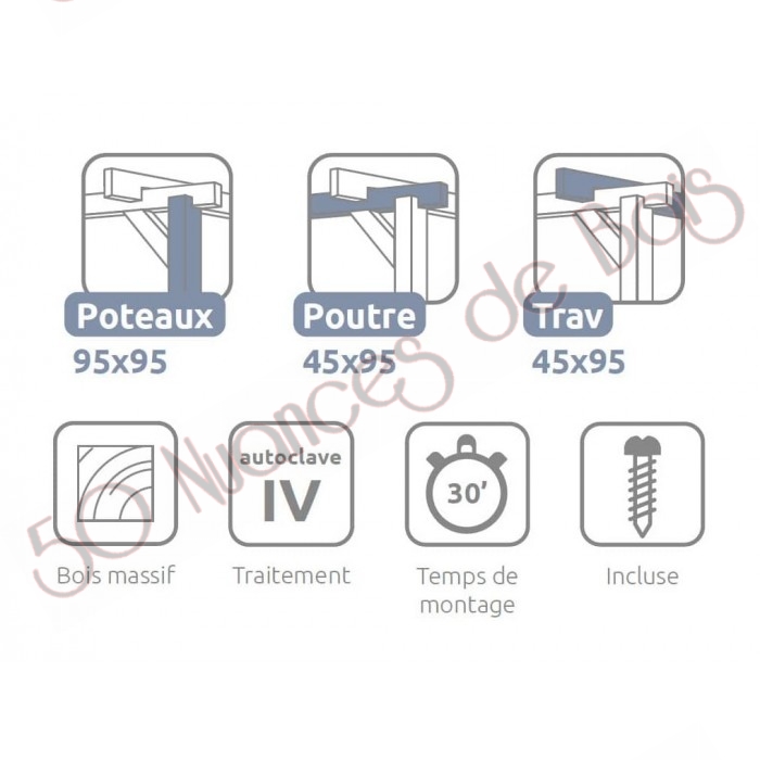 Vous pouvez couvrir le toit de cette pergola bois avec une solution telle qu’une bâche, un auvent coulissant, du canisse ou d’autres solutions similaires pour obtenir un espace ombragé et protégé du vent et de la pluie. Pour une stabilité correcte de cette tonnelle de jardin, il est impératif de la fixer correctement au sol. Pour ce faire, nous vous recommandons d’utiliser nos supports métalliques et d’acheter les vis appropriées en fonction de la surface sur laquelle elle sera installée.