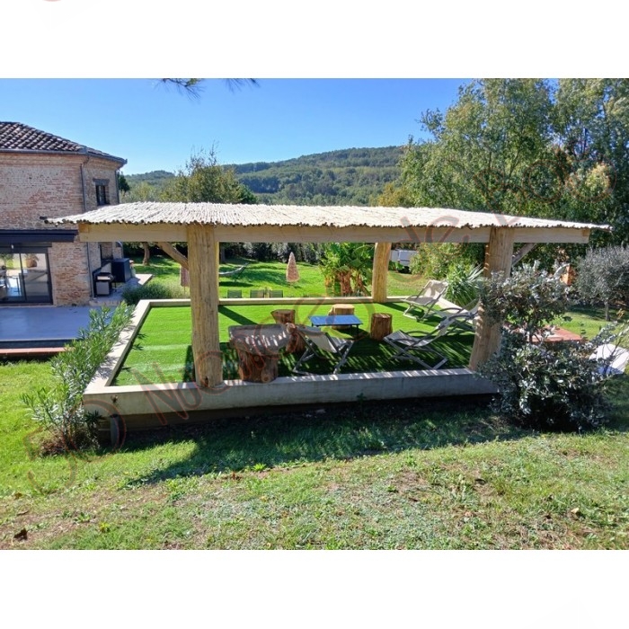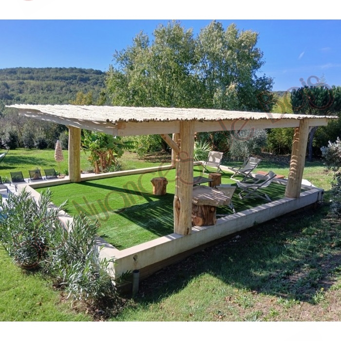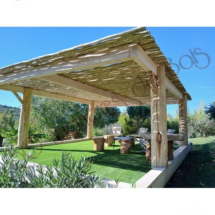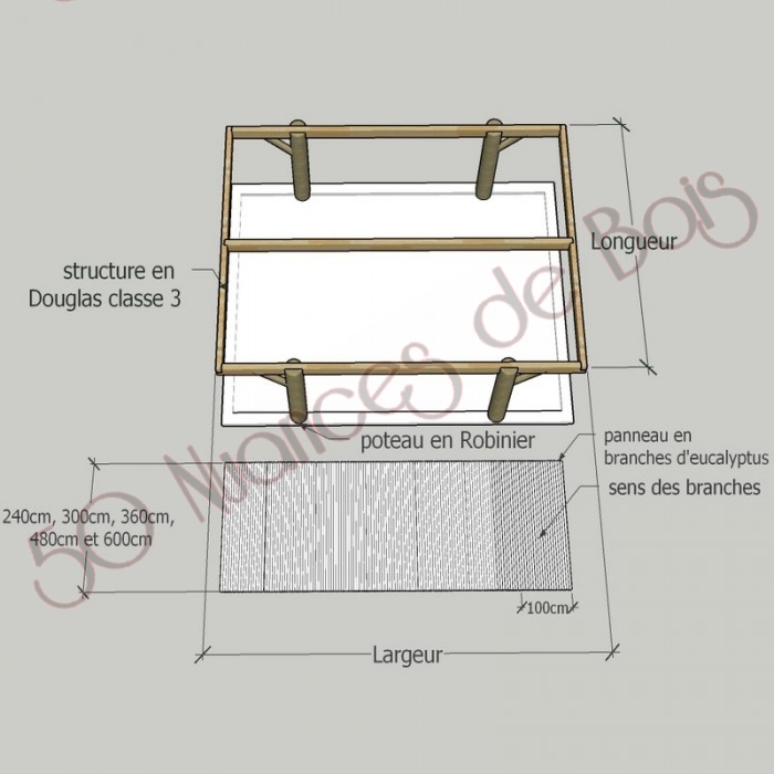 La couverture : en panneaux de branches d'Eucalyptus (ne contribue pas à la déforestation). Débordement de 15/20 cm de chaque côté de la pergola.