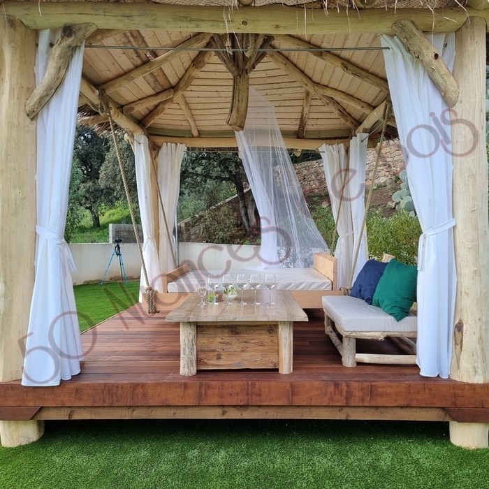 - La structure : en Robinier (acacia) très dense et dure, naturellement imputrescible. Dimensions au choix, sommier en bois massif traité pour l'extérieur
